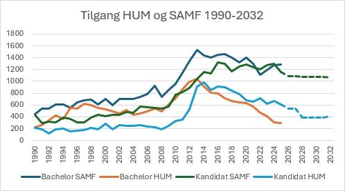Development in the number of students at the Faculty of Humanities (HUM) and the Faculty of Social Sciences (SAMF) 1990-2032